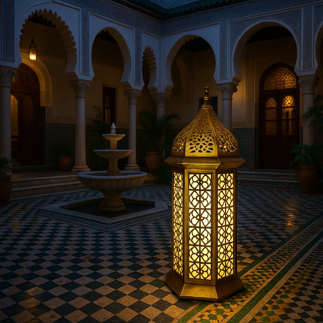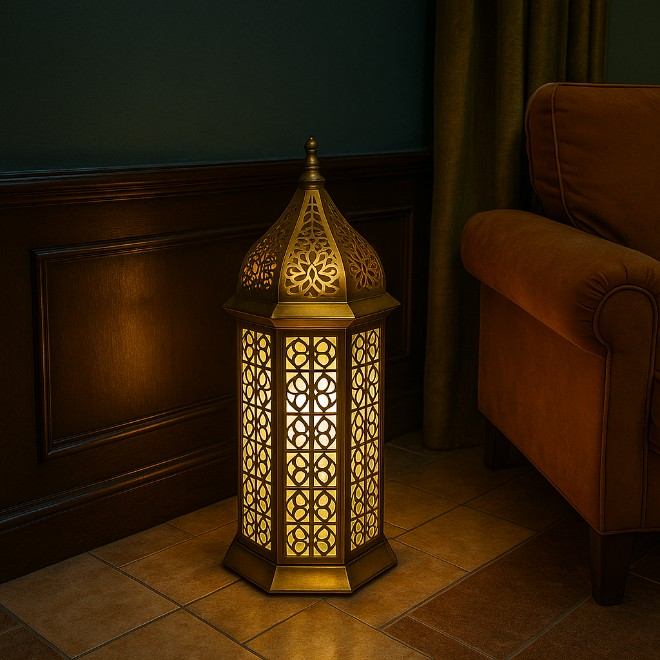 El yapımı, pleksi yüzeyli dış mekân lambası. Sekizgen formu ve kubbe detayıyla otel ve bahçelerde estetik ışık sunar.